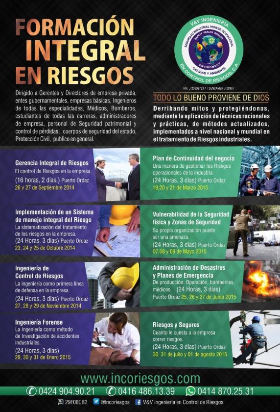 Empresa Nacional Dedicada a la Asesoría y Capacitación en Seguridad Salud Laboral, Ambiente, Evaluacion Ergonomica de Puestos de Trabajo, Atendemos y Asesoramos ordenamientos MINTRA, INPSASEL, MINAMB, BOMBEROS, Ingeniería en Control de Riesgos, Puerto Ordaz-Venezuela, Laboramos en todo el Territorio Nacional.